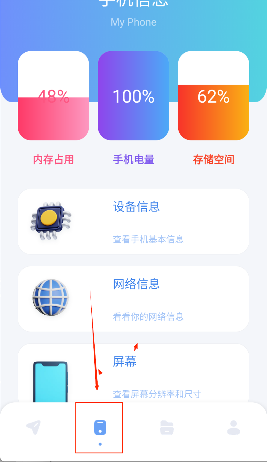 3、查看手机状态信息也很方便,启动“手机信息”应用后,上方会显示内存占用、电量和存储空间的百分比数据。