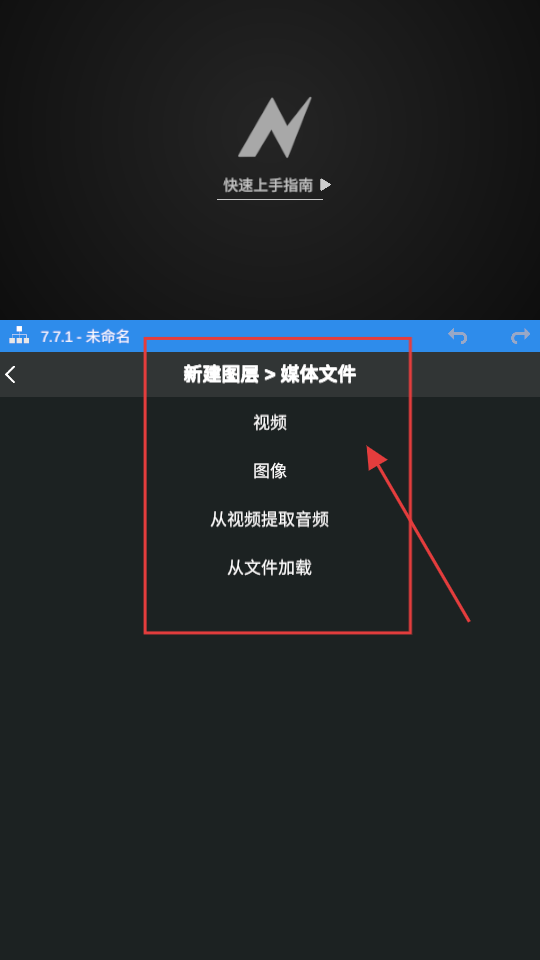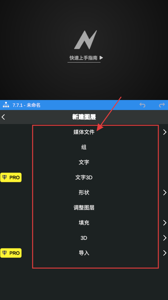 3、新建图层页面有媒体文件、组等选项,选择【媒体文件】就能添加视频、图像等素材啦。