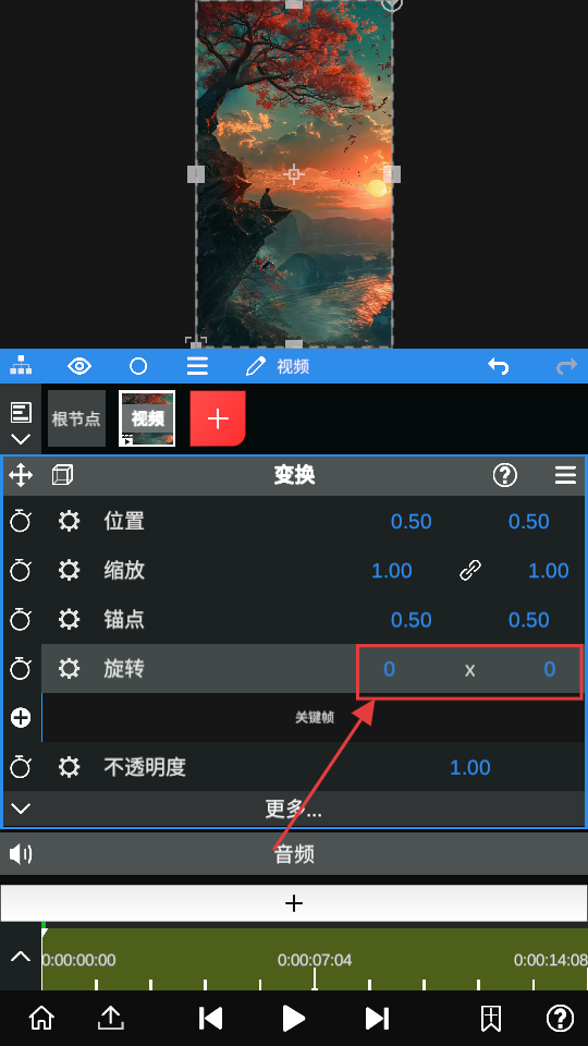 2、在变换设置区域,能看到旋转参数,现在旋转值是0,想调整视频旋转角度就看这里哟。