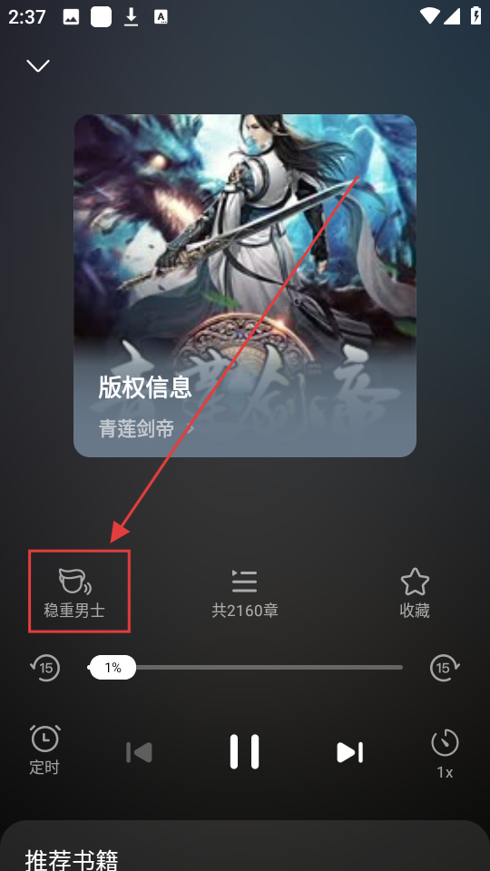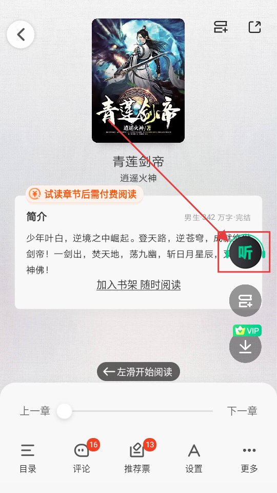 1、我们在《青莲剑帝》小说界面,点击【听】按钮,就能进入有声阅读模式,听小说内容啦。