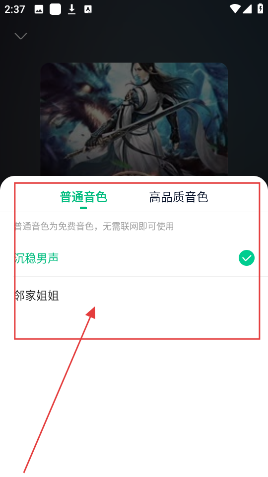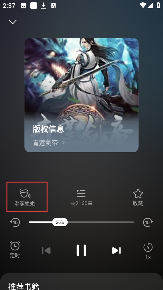 4、选择好音色(如“邻家姐姐”)后,界面会显示所选音色,有声阅读就会用该音色播放小说内容。