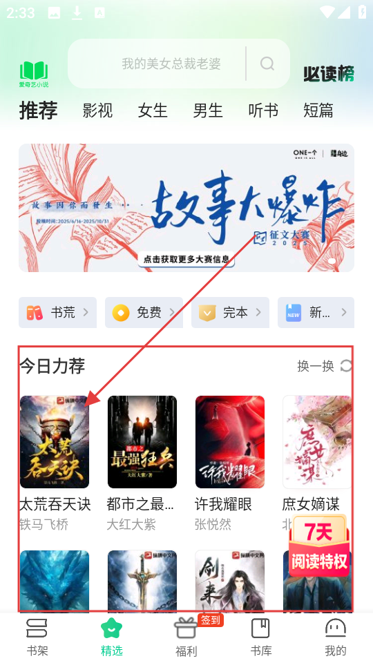 1、在爱奇艺小说精选页面,有“今日力荐”板块,挑选感兴趣的小说点击,就能进入小说详情页啦。