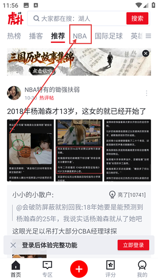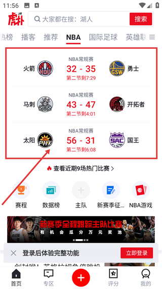 1、在虎扑首页,点顶部【NBA】分类标签,能切换到NBA专区,查看相关赛事和资讯内容哦。