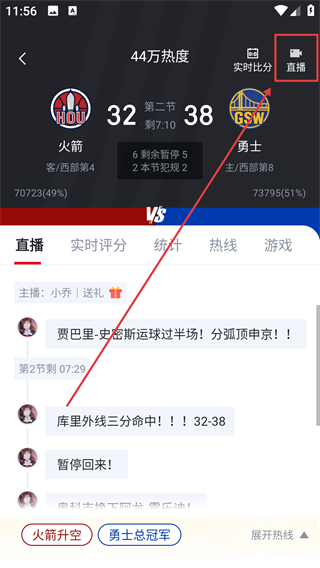 2、进入NBA专区后,能看到实时赛事比分列表,选目标赛事(比如火箭vs勇士)就能进入详情页啦。