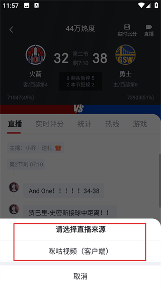 4、点直播按钮后会弹出直播来源选择框,选【咪咕视频(客户端)】就能跳转观看赛事直播啦。