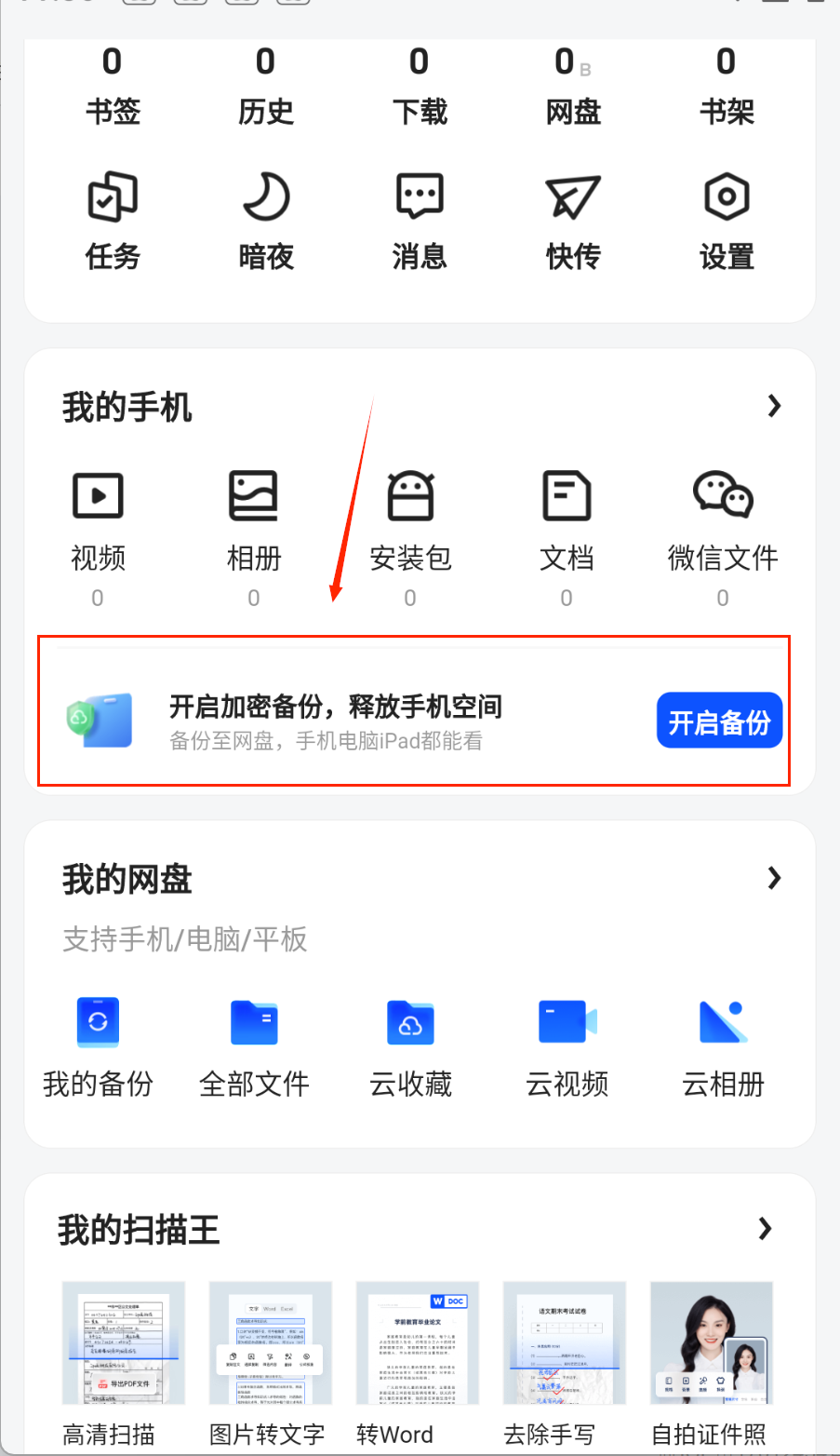2、善用网盘来备份重要数据,在“我的网盘”或备份功能中,可以选择将手机相册、微信文件等自动备份到云端。