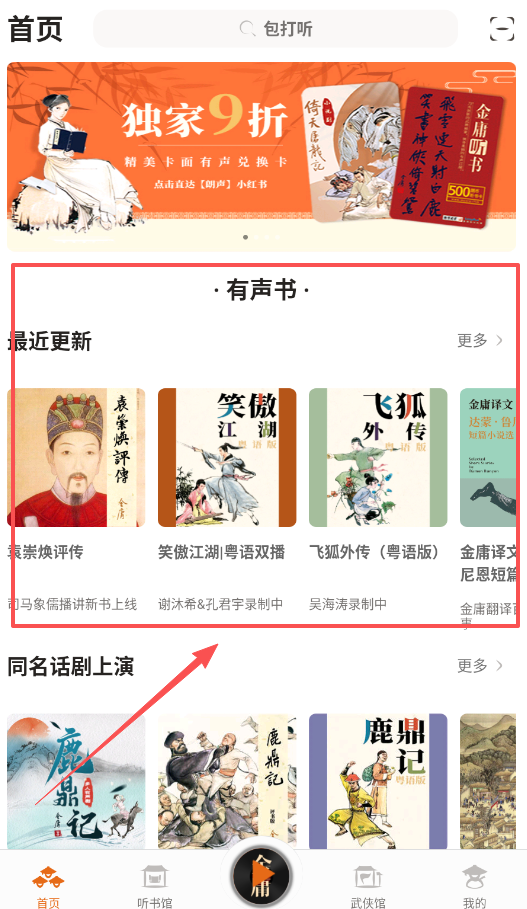 2、回到“首页”,你能看到丰富的听书内容,上方有“包打听”和“独家9折”等推广信息。