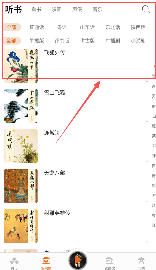 4、进入“听书馆”页面后,你可以通过顶部的筛选条件来缩小范围,快速定位到想听的金庸作品”。