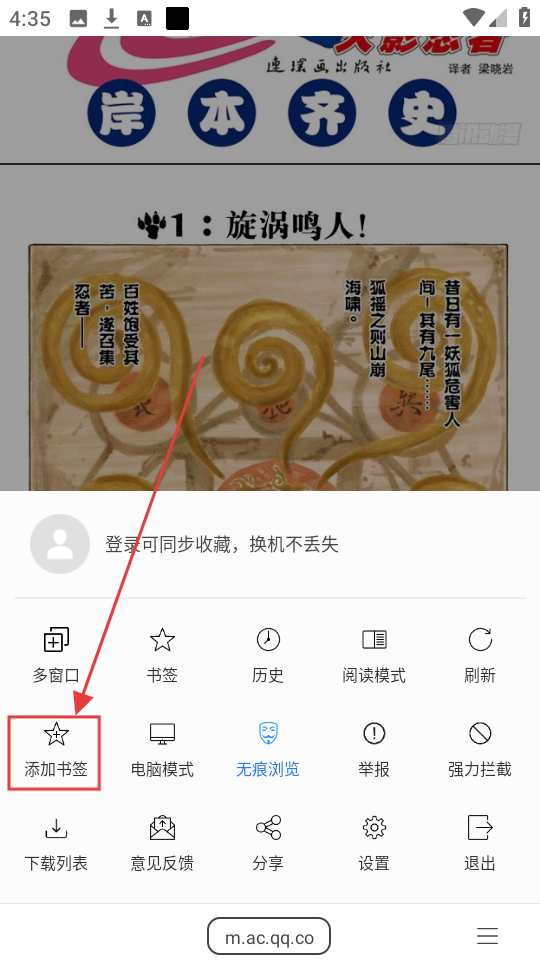 2、在展开的功能选项中,点击【添加书签】按钮,将当前漫画页面添加为书签哦。