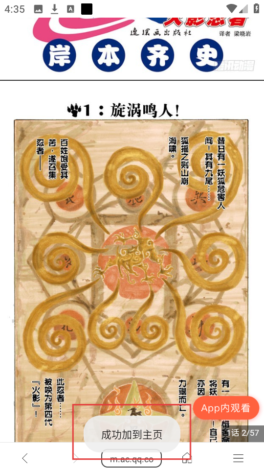 4、进入书签列表页面,能看到刚添加的【火影忍者(全彩版)】书签,下次想读时可直接点击访问啦。