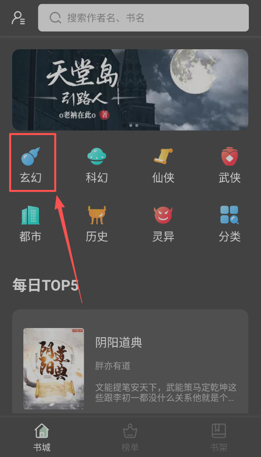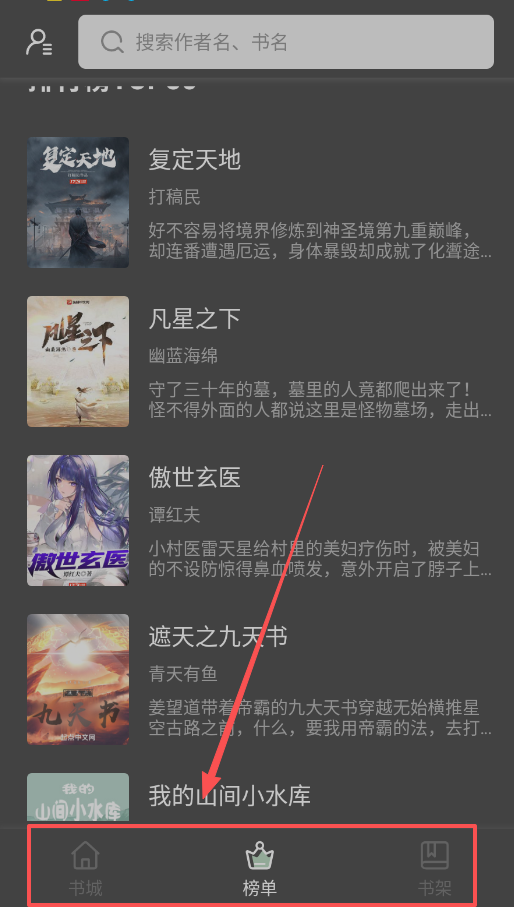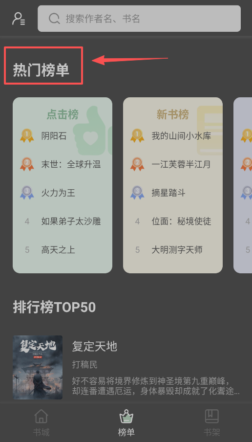 4、软件底部始终显示书城、榜单、书架三个导航按钮,找书时主要使用前两个功能,书城侧重分类推荐,榜单侧重数据排名。