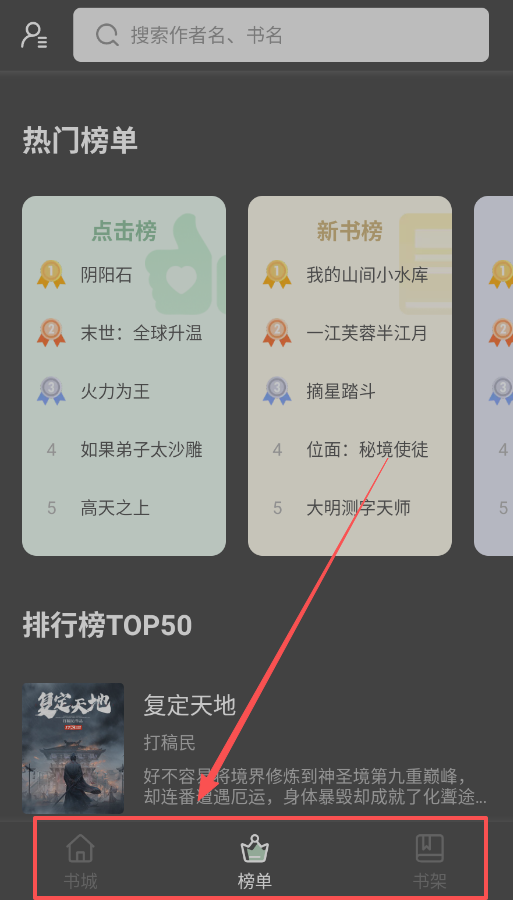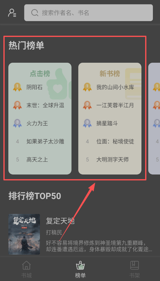 3、想了解大众口味可以点开榜单页面,这里提供了点击榜、新书榜等不同榜单。