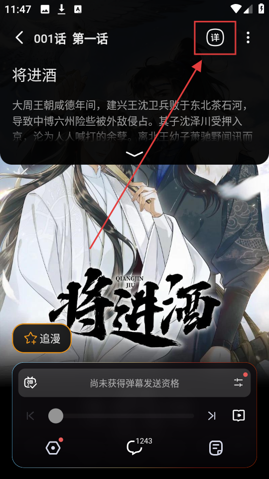 2、进入漫画后,点击右上角【详】,就能查看漫画的详细信息哦。