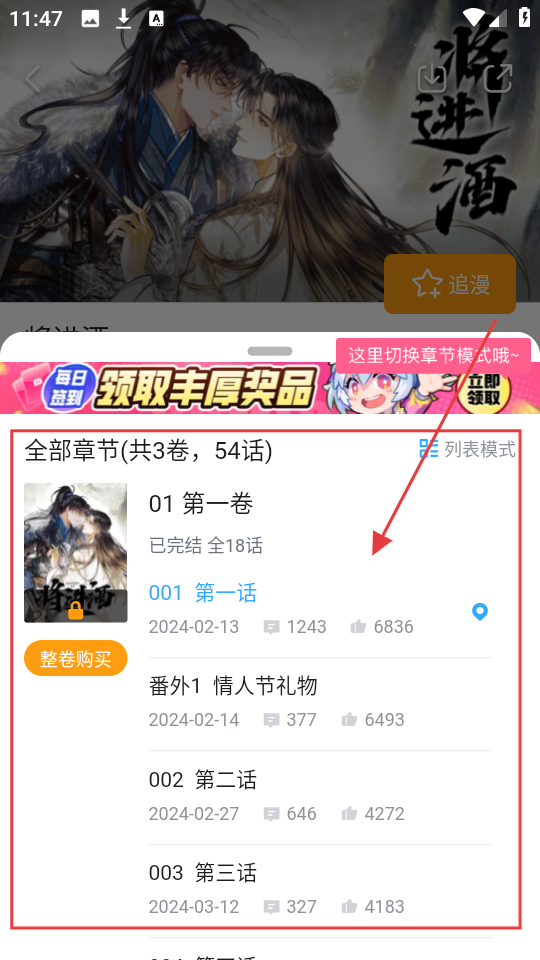 4、在目录里可以选择想看的章节,比如【001第一话】,随时阅读超惬意的哟。