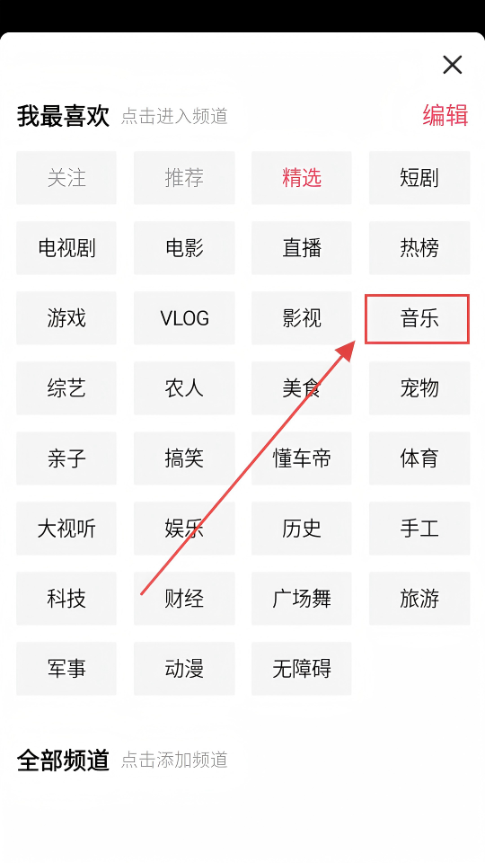 2、在频道选择界面,找到【音乐】频道并点击,就能进入音乐内容页面,畅享音乐啦。