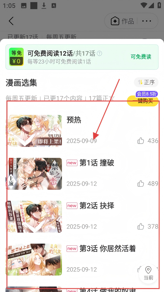 3、在剧情页面,能看到漫画选集列表,选想看的集数,就能阅读对应的内容啦。