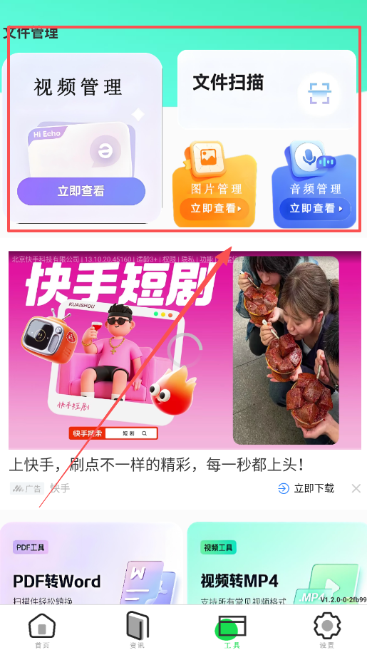 4、处理各类文件,可前往工具页面的文件管理,按视频、图片、音频等类型分类处理,满足格式转换的基本需求。