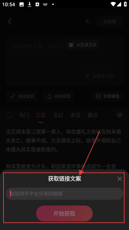 4、在获取链接文案界面粘贴快手平台分享链接,点击【开始获取】,即可提取链接中的文案啦。