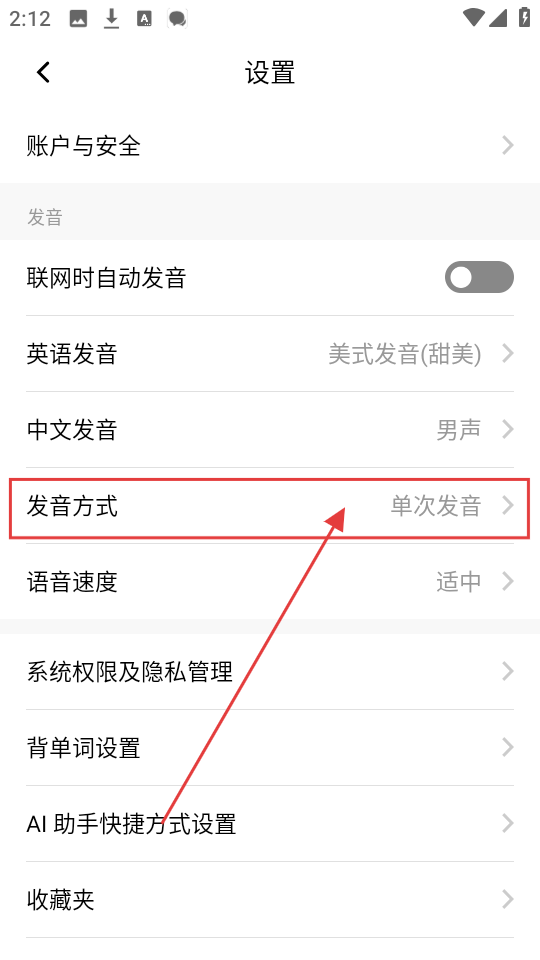 3、进入设置页面,找到【发音方式】选项,点击它,就能进入发音方式选择页面。