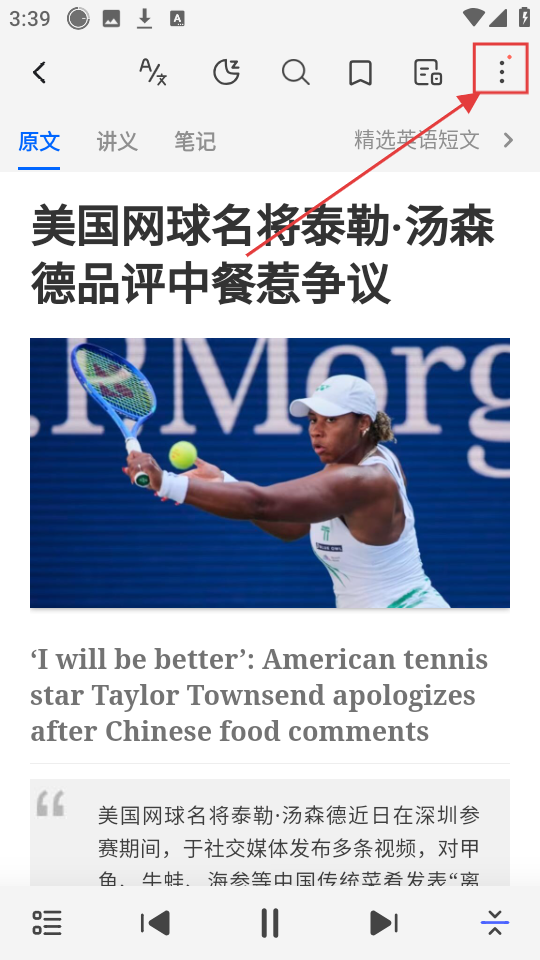 2、点开一篇短文后,看到右上角的三点图标,点它就能展开更多功能选项,超方便的呢。