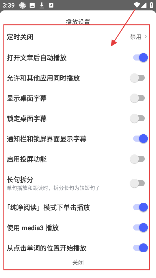 4、在播放设置页面,有【定时关闭】【自动播放】等诸多选项,可根据自己的需求去设置,超灵活的。