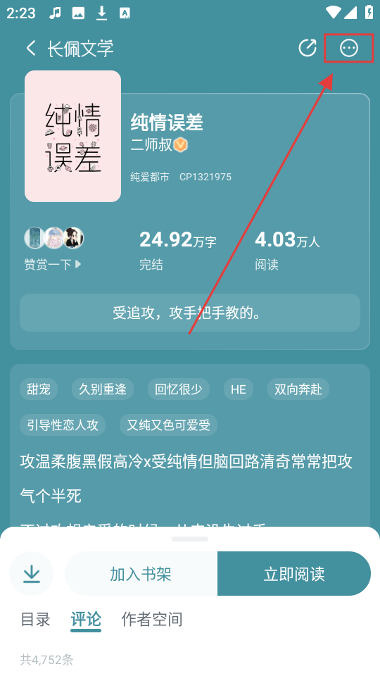 2、在《纯情误差》详情页面,点击右上角的更多按钮,就能展开更多操作选项哦。
