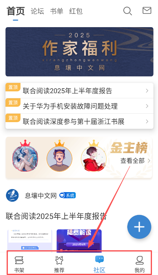 4、社区功能藏在底部导航最右边,点击进入后能看到论坛、书单等板块,还能领取红包和查看作家福利信息。