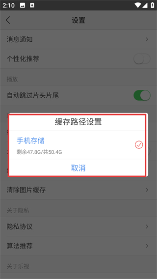 4、进入缓存路径设置界面后,可选择对应的存储位置(比如【手机存储】),完成缓存路径的配置哦。