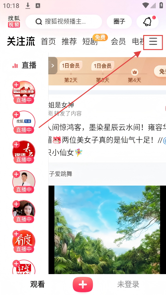1、在搜狐视频主界面,点击右上角的三条横线图标,进入频道选择页面啦。