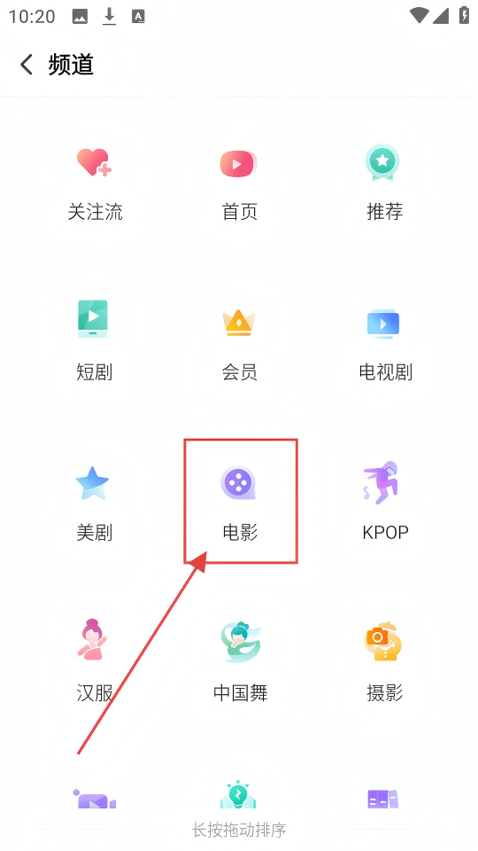 2、在频道页面中,找到并点击【电影】图标,就能进入电影专区哟。
