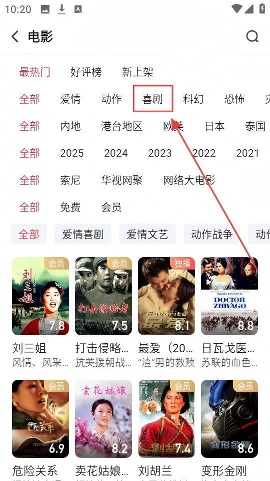 4、在电影分类页面,选择【喜剧】分类,就能看到相关喜剧电影,方便查找喜欢的影片啦。