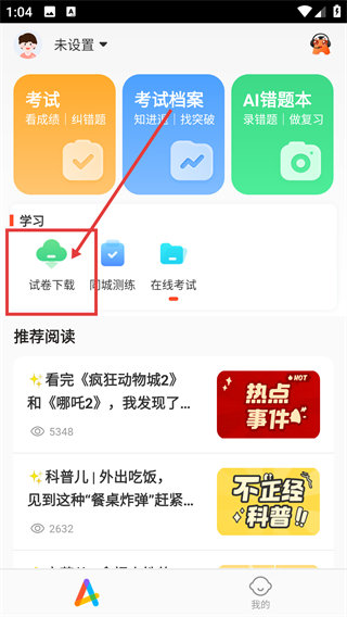 1、在APP首页点击【试卷下载】选项,就能进入试卷资源页面,开始查找需要的试卷啦。