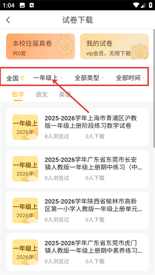 2、进入试卷下载页后,可通过年级、科目等筛选条件,找到对应学段(比如一年级上)的试卷资源哦。