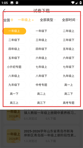 3、点击年级筛选按钮后会展开年级列表,可选择不同学段(比如二年级上)来切换试卷的目标年级啦。