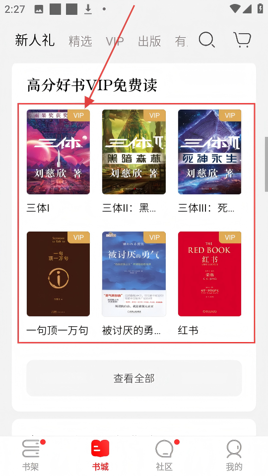 1、在书城,能看到【高分好书VIP免费读】板块,有《三体》等作品,选喜欢的点击封面进入详情页。