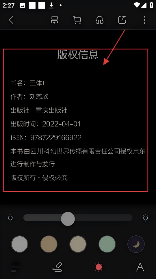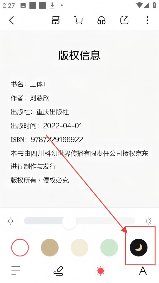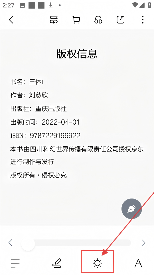 2、进入书籍页面,点击下方太阳图标,可调出亮度、主题等设置选项,超方便调整阅读体验。
