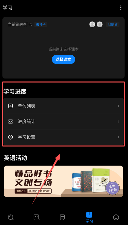 1、学习板块是核心,首先要去“选择课本”那里挑一本教材,不然没法开始,有很多练习题,可以经常去做做。