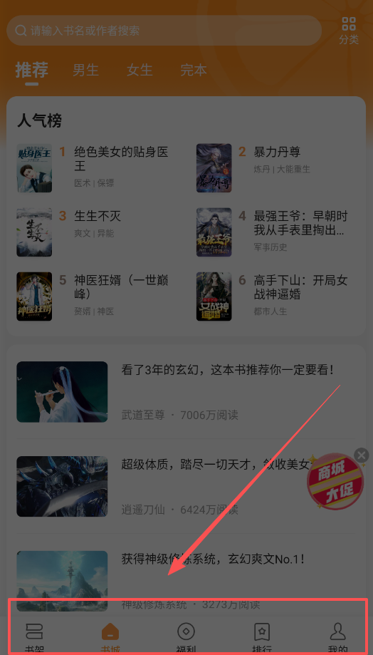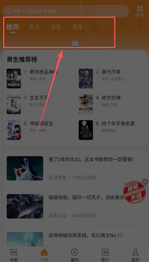 2、想精准搜索,就进入“书城”页,利用“都市人生”、“玄幻奇幻”等题材分类很快就能缩小范围。