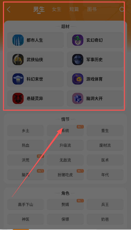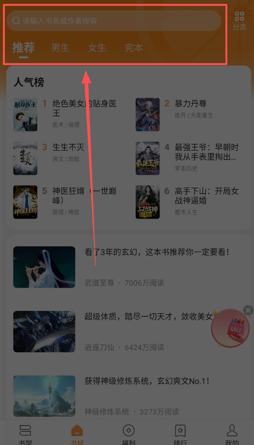 2、接着呢,如果想按类型找书,可以进入“书城”页,上方设有男生、女生、短篇等分类。