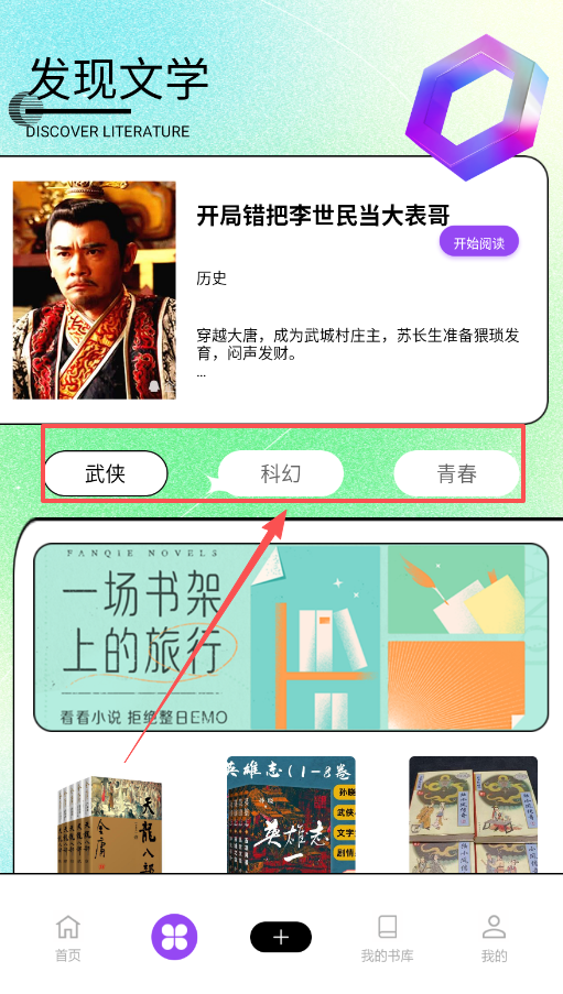 3、需要灵感或阅读时,切换到“发现”页,浏览历史、武侠等分类推荐,直接点击“开始阅读”就能体验他人作品。