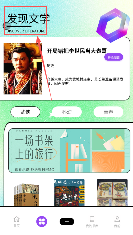 3、想阅读或找灵感,就切换到“发现”页面,那里有历史、武侠等分类推荐,点击“开始阅读”就能直接进入,丰富你的素材库。