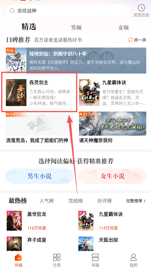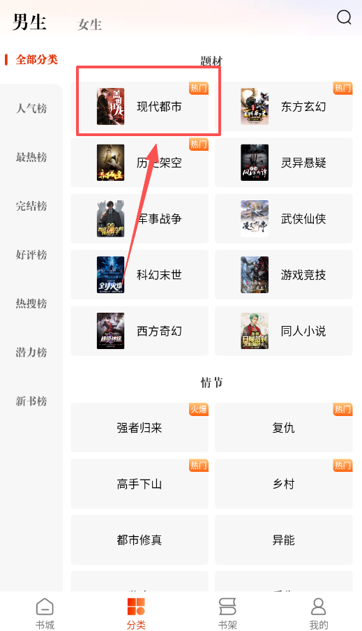 2、探索更多内容请进入书城页面,你可以按性别频道切换,或通过现代都市、强者归来等具体标签来筛选想看的书籍类型。