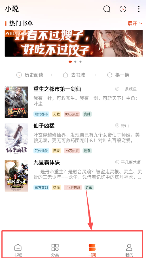 4、软件底部常驻四个功能入口,书架用于集中管理你的收藏,分类页则聚合了历史阅读和热门书单等动态推荐。