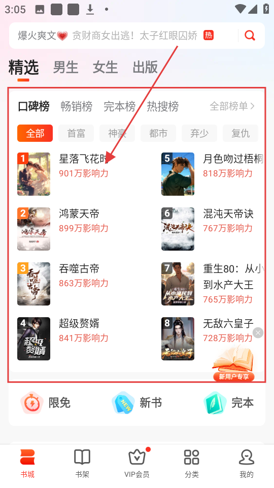 1、我们进入软件,能看到各类榜单的小说,若对某本小说感兴趣,点击小说封面或标题。