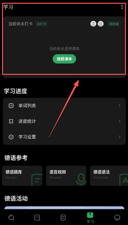 1、学习板块是核心,首先要去“选择课本”那里挑一本教材,不然没法开始,有很多练习题,可以经常去做做。