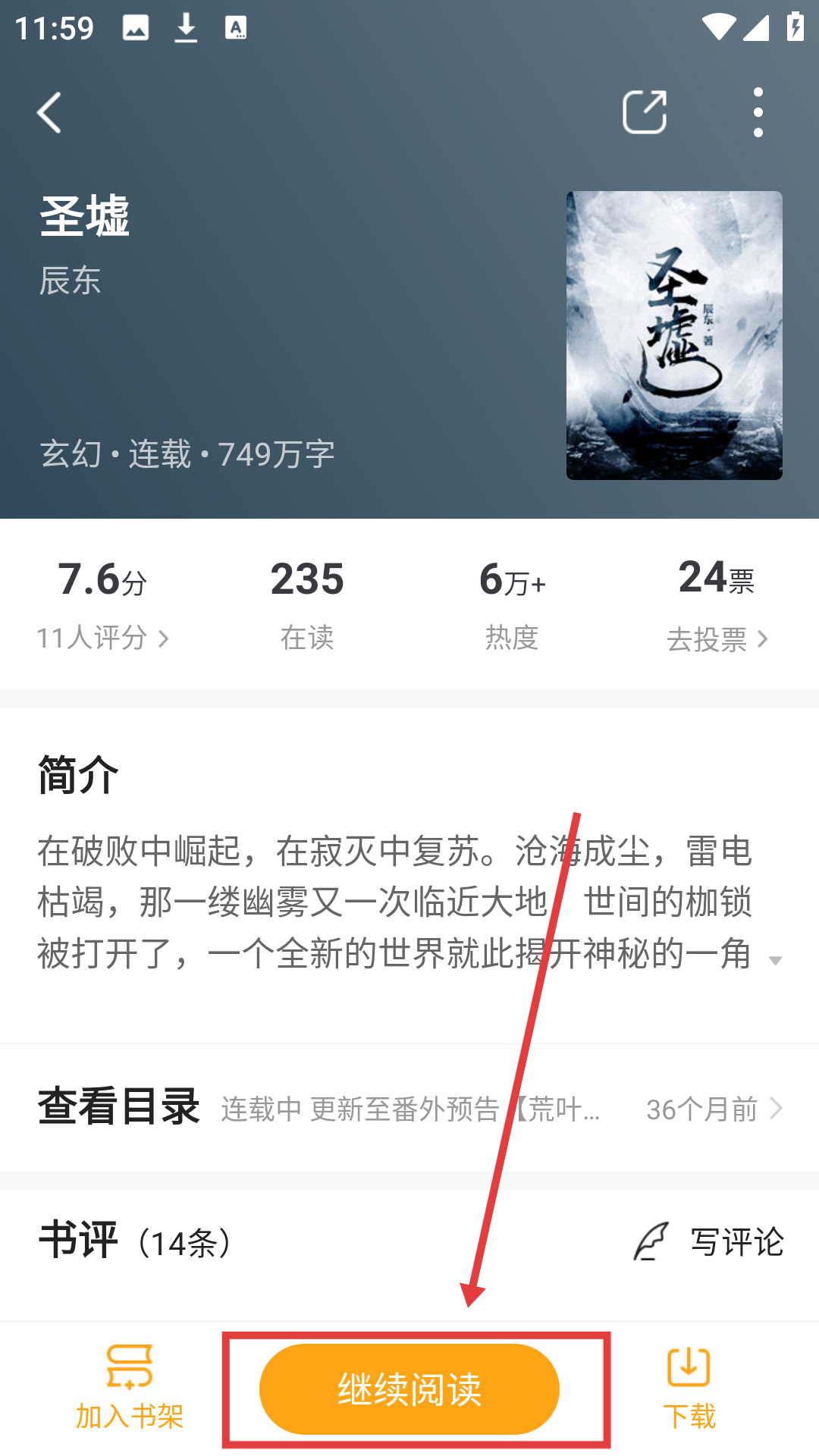 1、在小说详情界面点击【继续阅读】,进入阅读界面,开始阅读小说啦。