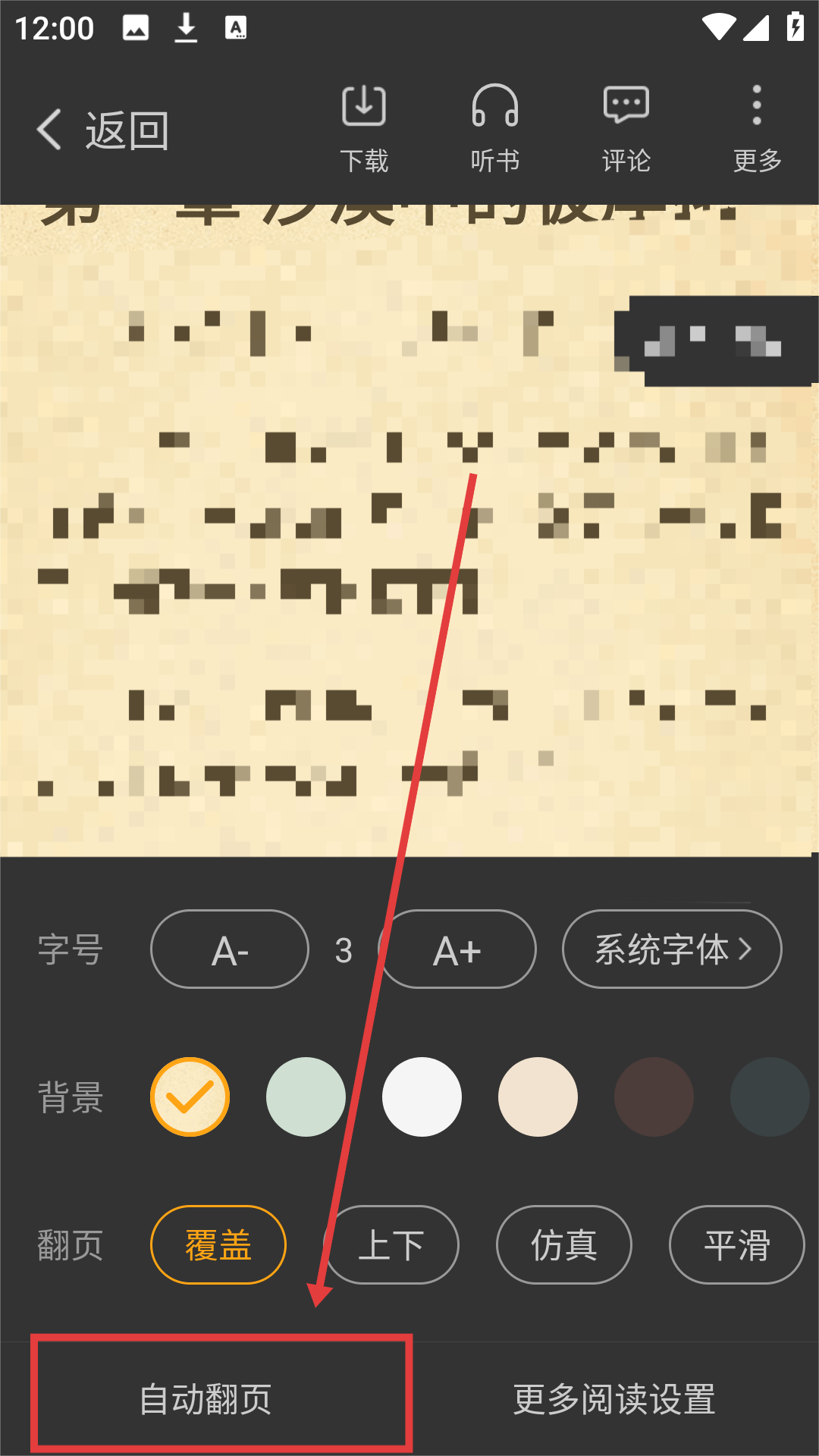3、在设置选项中点击【自动翻页】,进入自动翻页设置界面,开启自动翻页功能啦。