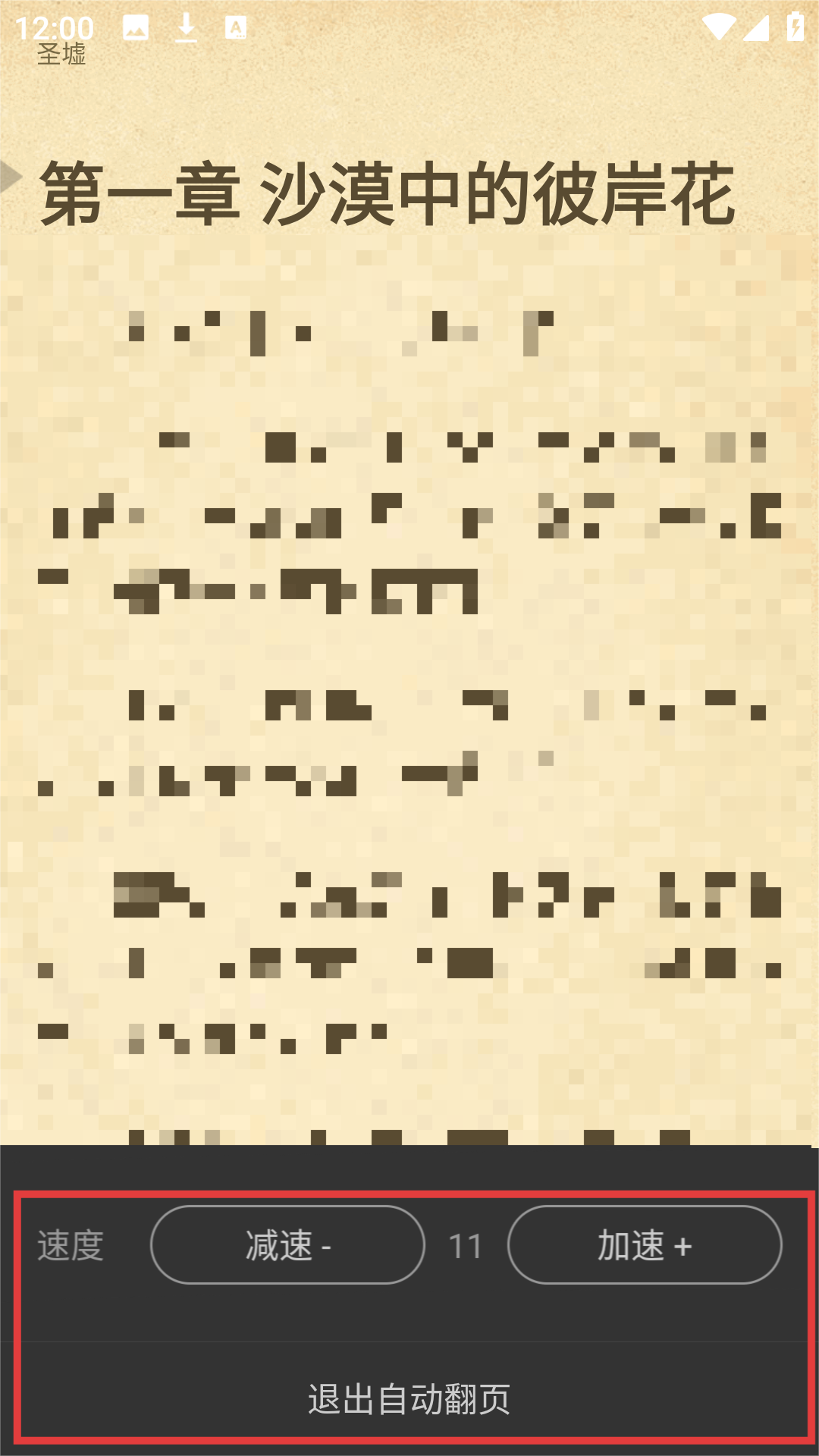 4、在自动翻页设置界面调整速度,可【加速+】或【减速-】,让阅读更顺畅哦。