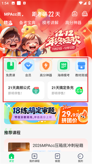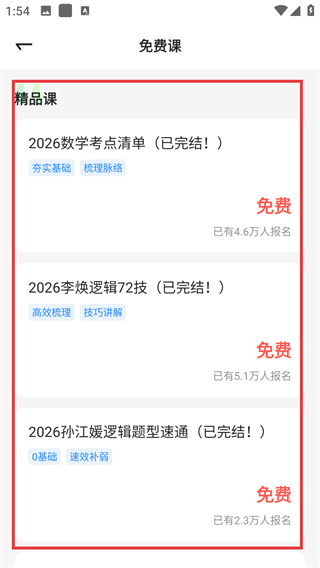 1、在这款APP的课堂页面,点击【免费课】选项,进入免费课程列表界面,可挑选适配的备考课程啦。