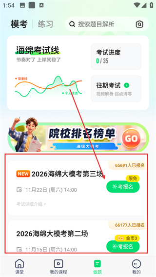 4、切换到做题页面,找到【2026海绵大模考第三场】,点击【补考报名】按钮,可参与模考检验学习效果啦。